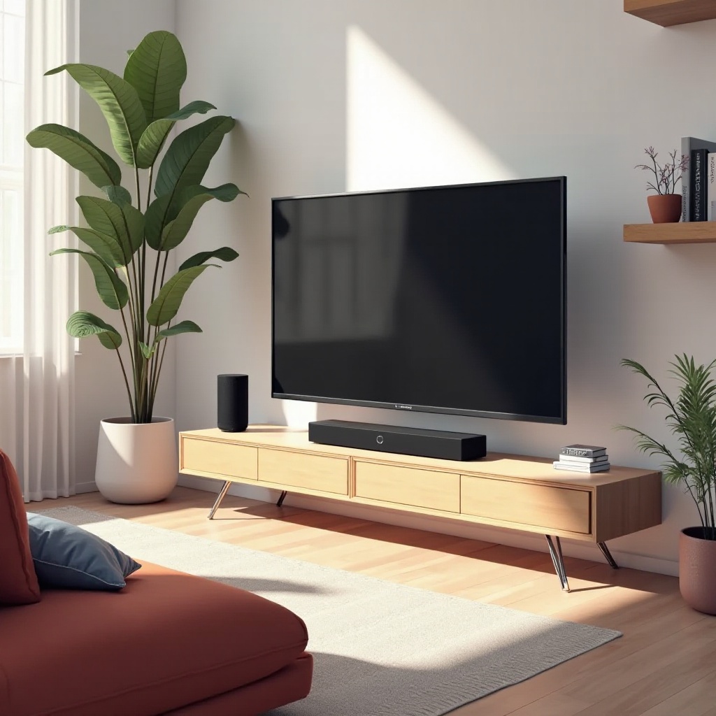 Poloha soundbaru: Ideálně jej umístěte pod vaši televizor pro optimální rozptyl zvuku. Montáž na stěnu je také možností, pokud nabízí lepší umístění.